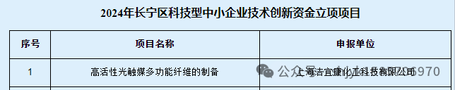 (4)“高活性光触媒多功能纤维的制备”项目以其独特的创新性与前瞻性,成功入选 2024 年度长宁区科技型中小企业技术创新资金立项名单,获得资金支持与官方认可,为项目的进一步研发与推广注入了强大动力。
