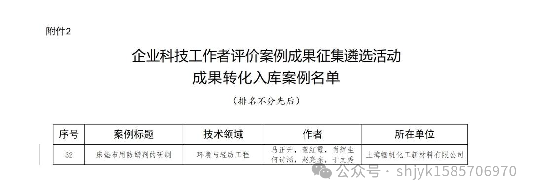 (7)上海帼帆化工新材料有限公司参与企业科技工作者评价案例成果征集遴选活动,经同行评议,上海帼帆化工新材料有限公司在床垫布用防螨剂的研制在环境与轻纺工程技术领域成功遴选入库。