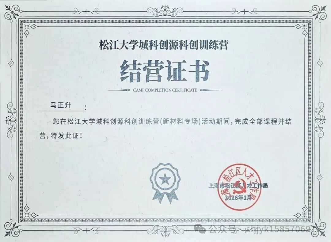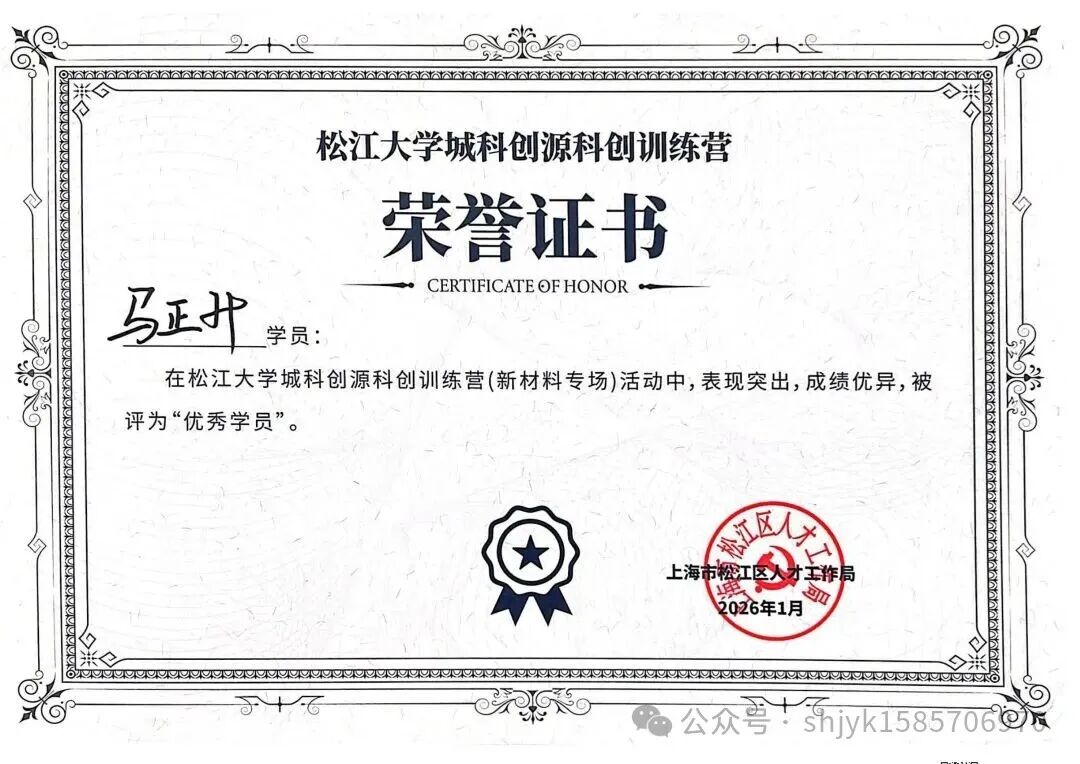 近日,松江大学城科创源科创训练营(新材料专场)圆满落下帷幕。上海洁宜康化工科技有限公司的马正升先生,凭借在训练营期间的出色表现,荣获“优秀学员”称号,其所在小组(齐鲁科创小组)亦获评“优秀小组”荣誉,展现了他在科技创新与团队协作中的卓越风采。