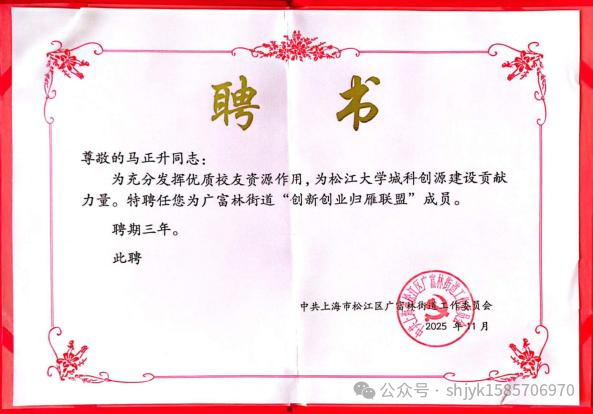 (3)马正升博士凭借深耕功能材料领域的深厚积淀与前瞻布局,正式受聘为和勤易专精特新企业家俱乐部新材料行业秘书长,并同步入选中共上海市松江区广富林街道“创新创业归雁联盟”核心成员。他在不同领域的积极担当,为行业交流与合作搭建了更加广阔的平台。