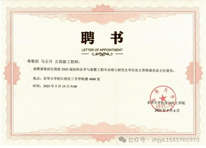 (7)马正升教授凭借深厚的学术造诣与丰富的行业经验,受邀参与 2025 届纺织化学与染整工程专业硕士研究生学位、江南大学纺织科学与工程学院硕士研究生学位论文评审工作。他为培养行业未来人才贡献力量,为行业的可持续发展注入新的活力。